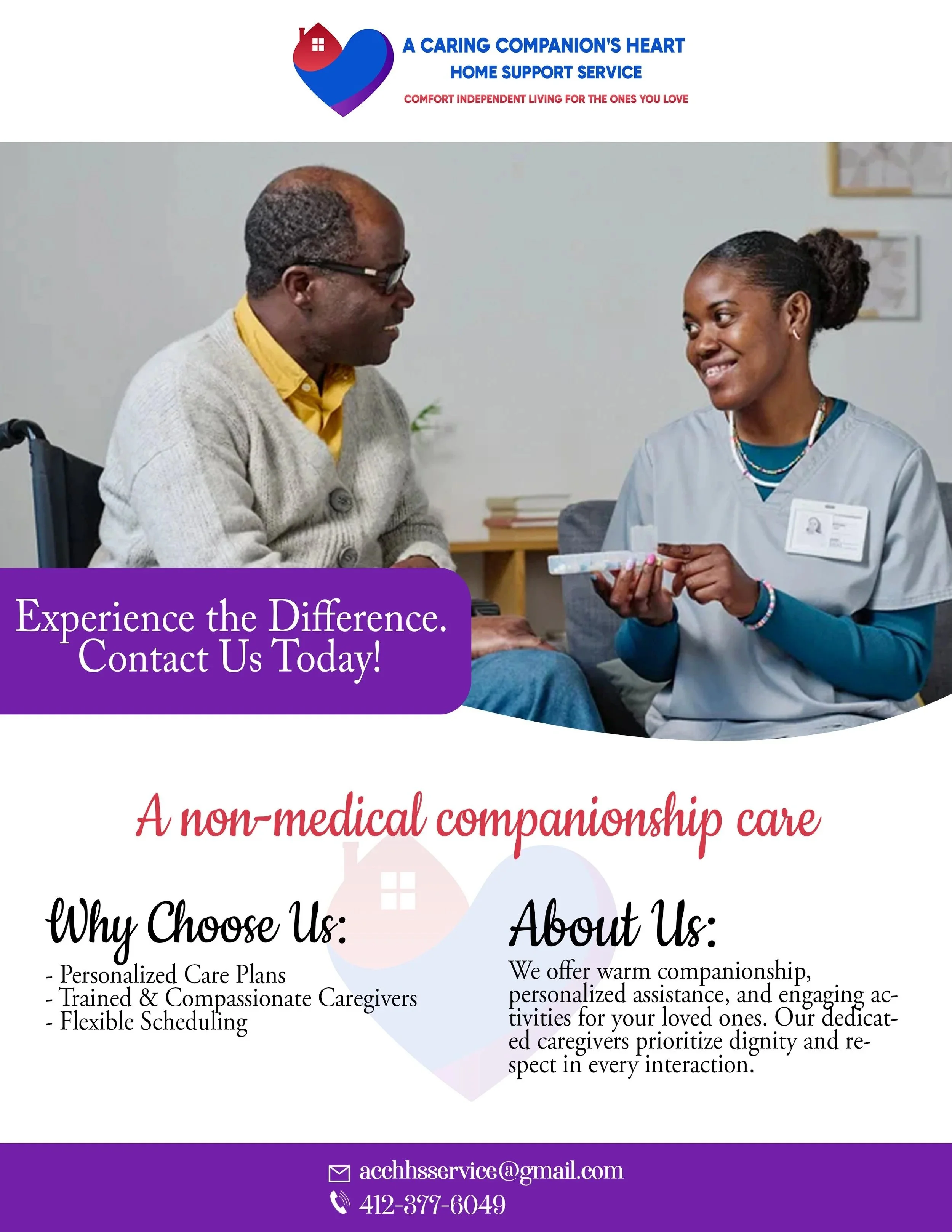 A Caring Companion’s Heart is licensed to provide non-medical and companionship services to individuals who wish to remain independent in their own homes while receiving supportive, person-centered care.